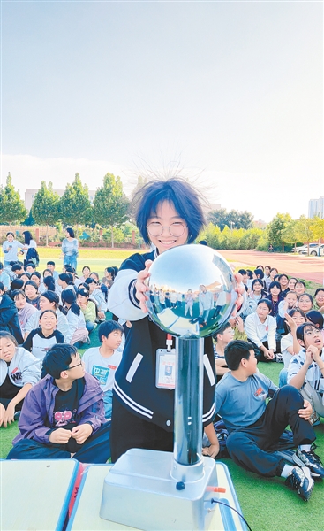 科学秀结束后,活动进入沉浸式体验环节。同学们分批次有序参与科普互动站点的闯关活动:“怒发冲冠”静电实验让头发竖立,生动展示电学现象;巨型泡泡体验使学生置身于表面张力的奇妙世界;音叉共振现象让人直观感受声波的传播规律;气爆纸杯阵挑战赛锻炼学生的动手能力;电碰迷宫游戏培养专注力和手眼协调能力。学生们在亲手操作和仔细观察中,不仅巩固了理论知识,更体验到科学探索的乐趣。(记者 刘盼盼 文/图)