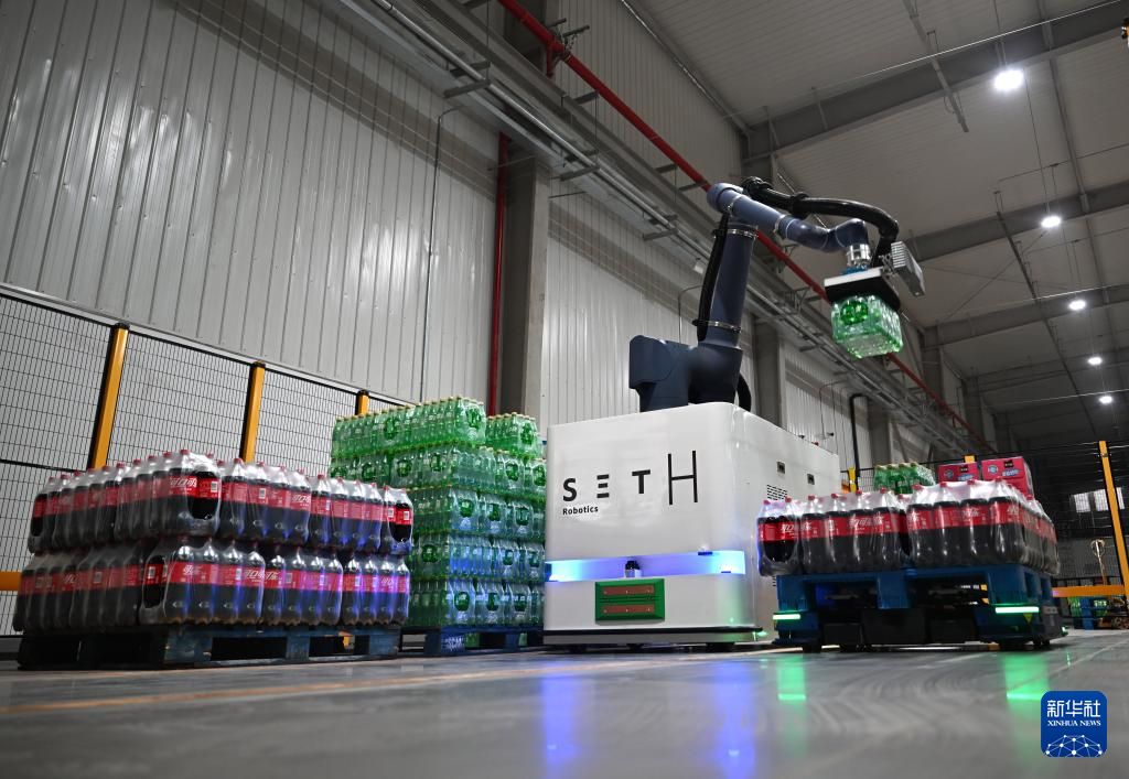 10月16日在太古可口可乐郑州新厂拍摄的智能拣配机器人。新华社记者 李嘉南 摄