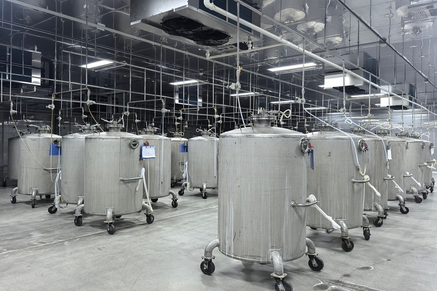 图为食用菌生产厂房内的标准化不锈钢容器。