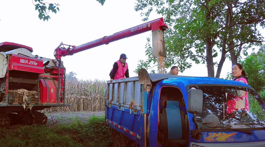 10月16日,河南省郏县安良镇任庄村妇联协调履带式收割机,助力困难户收割玉米。