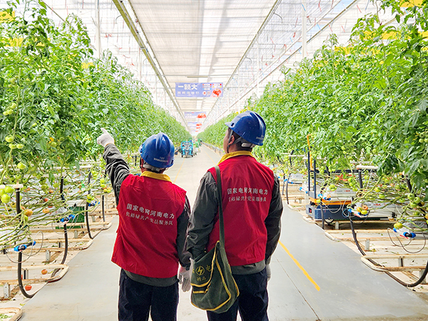 图为国网濮阳供电公司工作人员在西辛庄村现代智慧化西红柿种植基地开展实地走访。