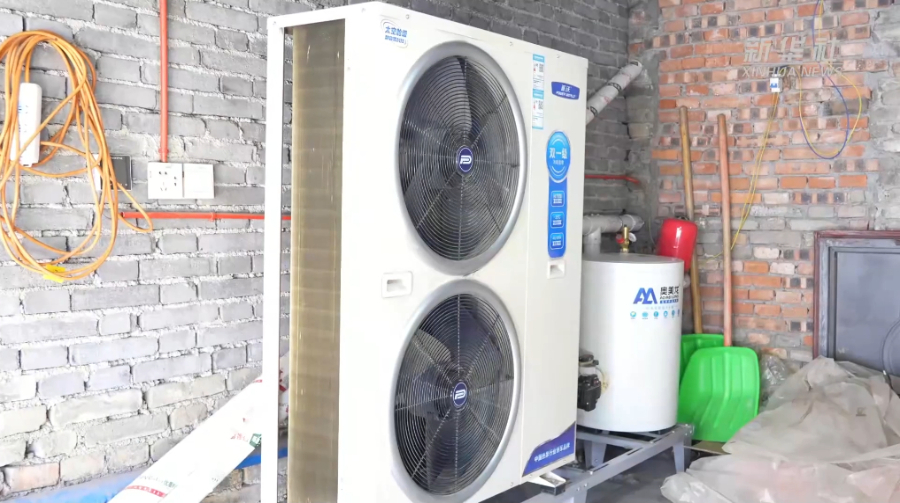 在郑州登封市君召乡,安装工孔宏世正忙着调试空气源热泵电取暖设备。空气源热泵采用能源转换技术,在消耗少量电能的情况下,热泵从空气中吸收热量并转化为高温热能,从而实现供热。