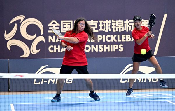 9月25日,2025全国匹克球锦标赛在河南省鹤壁市开赛。图为中国香港代表队球员庾颖琛(左)/吴丽萍在混双比赛中。新华社记者 朱祥 摄