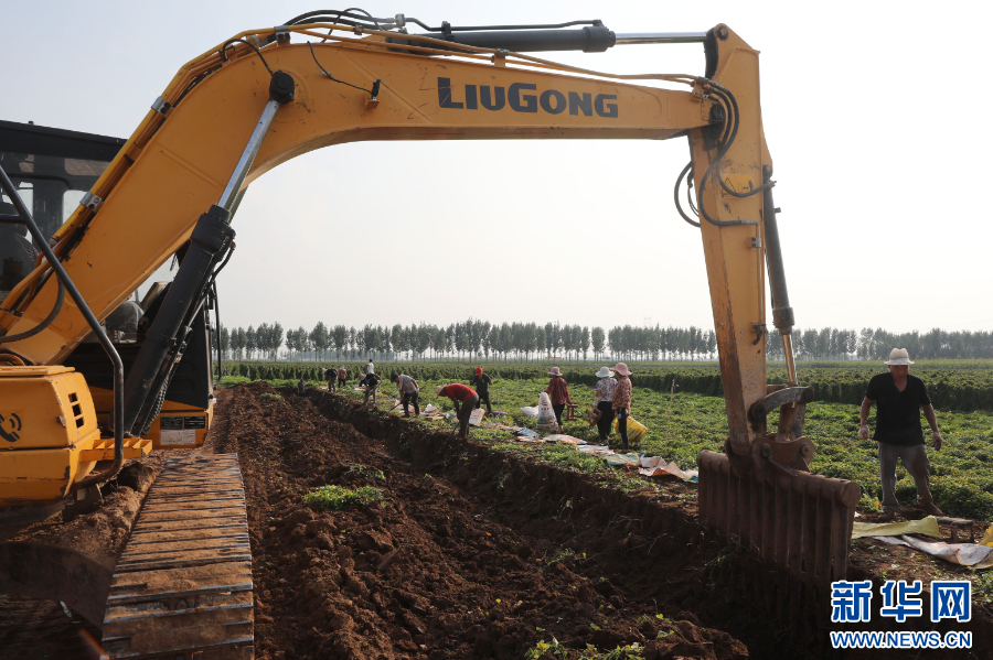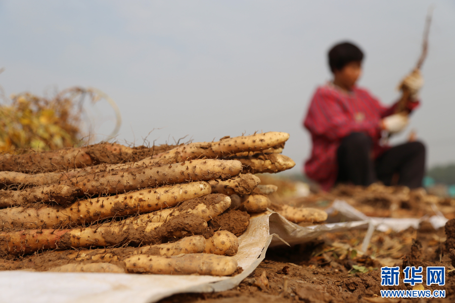 河南省焦作市温县一家农业合作社的农户在收获铁棍山药。