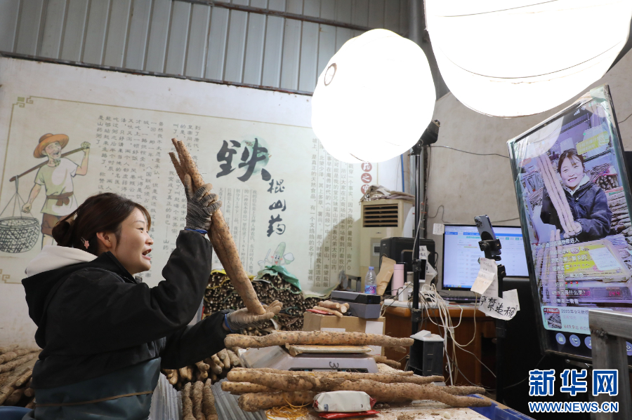 河南温县一家农业企业的主播正在直播销售铁棍山药。