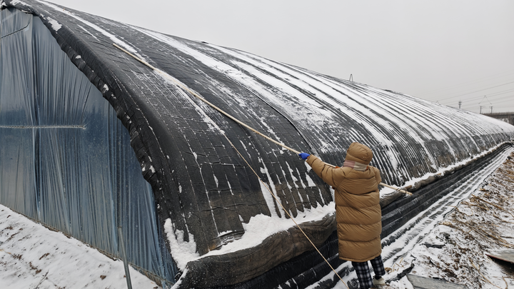 1月19日,在卫辉市汲水镇下园村,种植户正在清理大棚积雪。李冰砚 摄