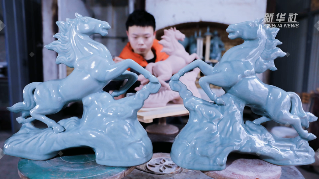 随着马年春节临近,素有“汝瓷之乡”美誉的河南省宝丰县的汝瓷艺人们以马为主题,创作、烧制汝瓷生肖马系列产品。这些造型各异的汝瓷马,除了订单销售外,手艺人们还积极利用网络直播平台进行线上销售,供应节日市场。
