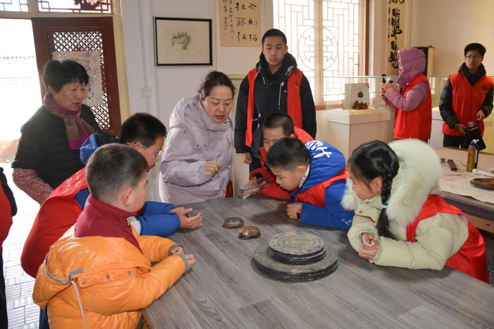 2月6日,河南省三门峡市陕州区人马寨王玉瑞澄泥砚展示馆,几名学生志愿者正在了解黄河澄泥砚的制作工艺。董振振 摄