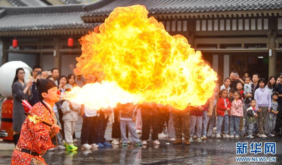 2025年10月5日,在河南省洛阳市洛龙区龙门古街景区,民间艺人为游客表演喷火。新华社发(黄政伟 摄)