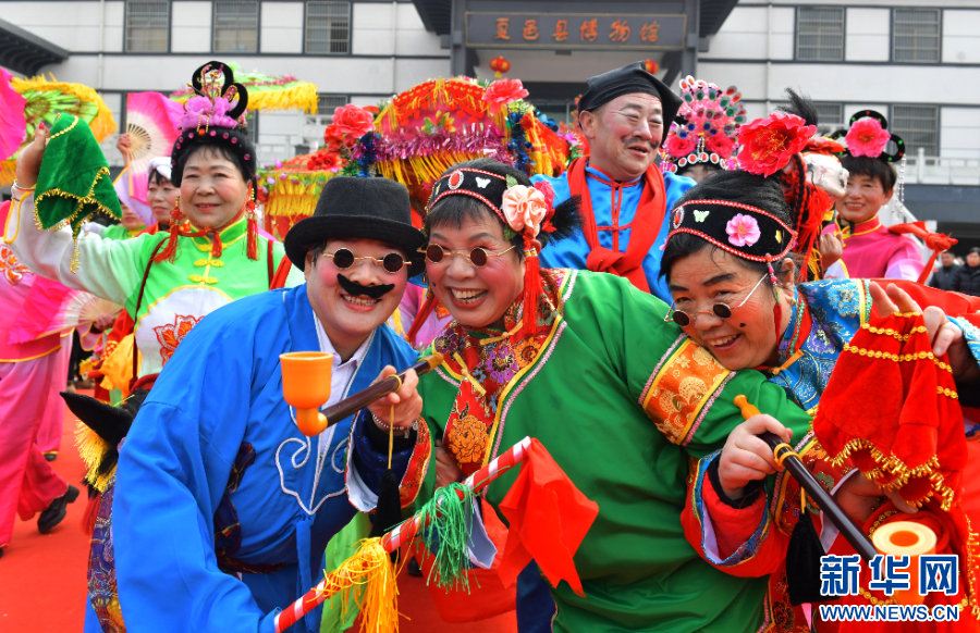 2025年2月12日,在河南省夏邑县博物馆广场,民间艺人在闹元宵民俗展演活动中表演。新华社发(苗育才 摄)