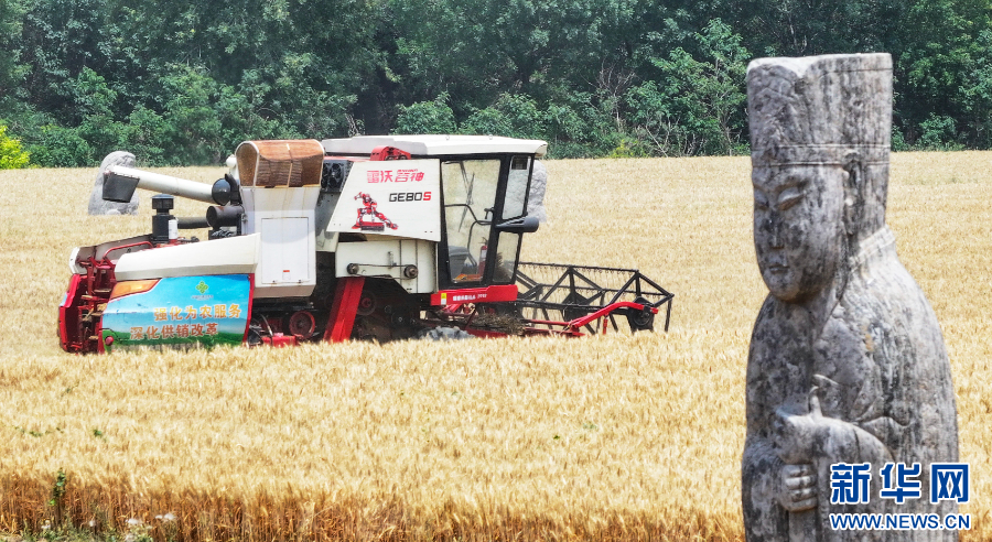 2025年6月2日,在河南省巩义市永熙陵,农民驾驶收割机收割小麦。新华社发(马健 摄)