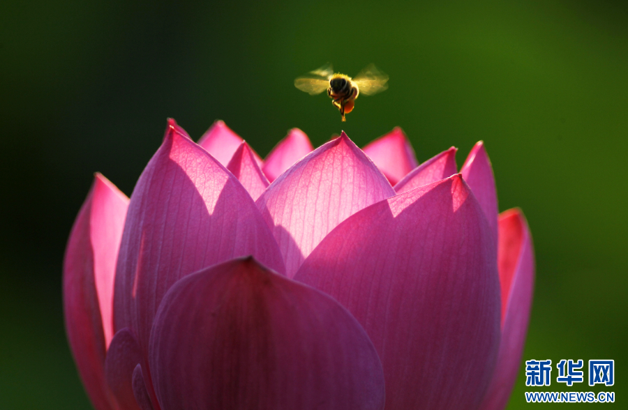 2025年6月27日,蜜蜂在河南省许昌市护城河荷花丛中飞舞。(牛书培 摄)