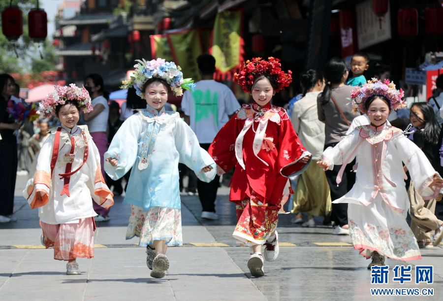 2025年5月1日,小朋友身着汉服在河南省许昌市曹魏古城游玩。新华社发(牛书培 摄)
