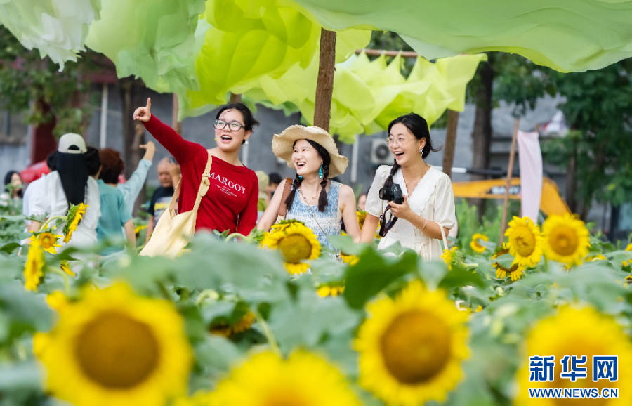 2025年8月12日,游客在河南省驻马店市西平县老王坡产业融合发展示范区的百亩油葵花海游玩。正值暑期,人们游玩度假、休闲避暑,乐享美好时光。新华社发(赵永涛 摄)