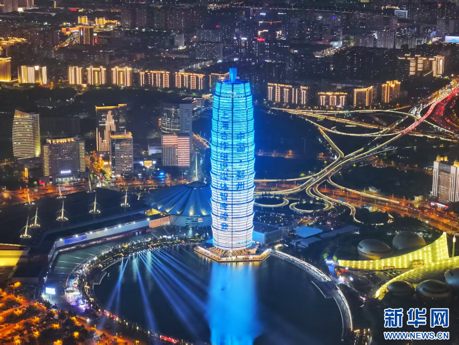 2025年7月23日晚,郑州国际会展中心旁的千玺广场主楼亮灯宣传上海合作组织媒体智库峰会(无人机照片)。新华社发(付锐 摄)