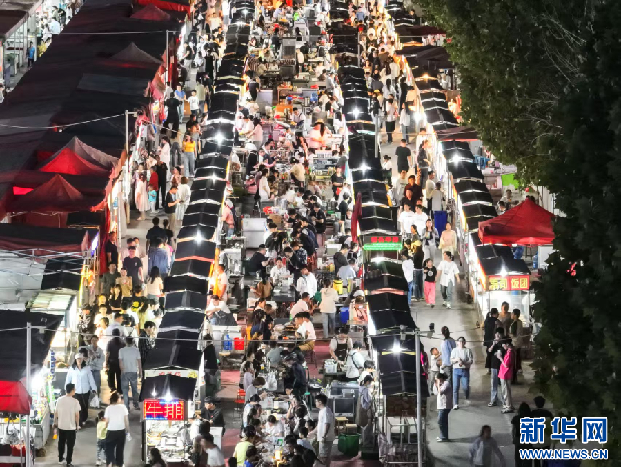 2025年5月1日,游人在河南省济源市沁园街道御驾庄特色小吃一条街品尝美食(无人机照片)。新华社发(苗秋闹 摄)