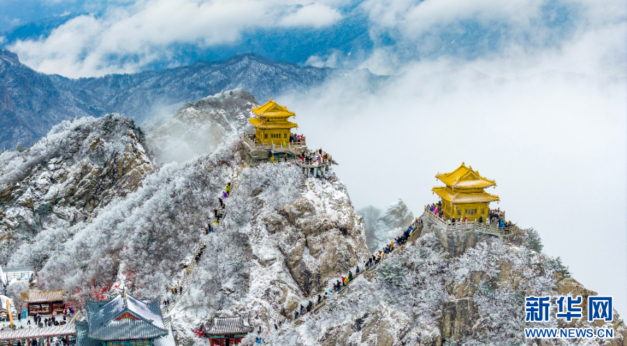 2025年12月20日,河南省洛阳市栾川县雪后的老君山风景如画,吸引众多游客前来拍照打卡。(张怡熙 摄)