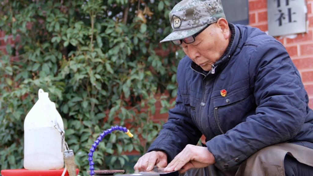 人群中,79岁的孟来发摆好磨刀摊,刚把工具放下,村民就围了上来,一直忙到午饭前,他才双手撑着腿从小凳上站起身,握拳捶了捶腰背。不远处,75岁的耿国胜手里拿着志愿者登记表,在人群中穿梭。谁第一次来、谁参加过几次,他都一一记下。