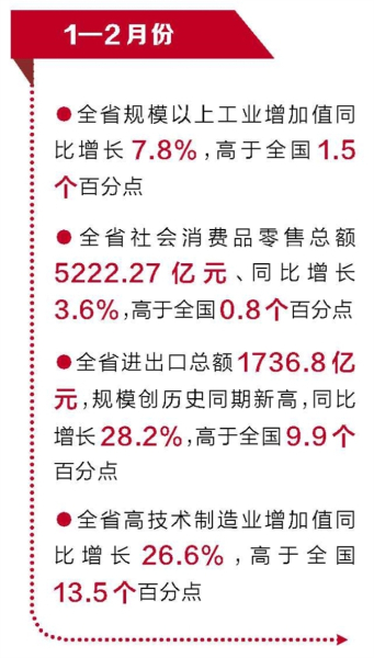 进出口保持高速增长。1—2月份,全省进出口总额1736.8亿元,规模创历史同期新高,同比增长28.2%,高于全国9.9个百分点。其中,出口1021.2亿元、同比增长12.7%,进口715.6亿元、同比增长59.7%。外贸主体活力增强。有进出口实绩的外贸企业数量达1.12万家,同比增长36.5%;民营企业进出口1331.6亿元,同比增长38.7%。新兴市场快速增长。对东盟进出口227.3亿元,同比增长35.8%;对拉美进出口175.8亿元,同比增长8.8%;对非洲进出口75.8亿元,同比增长41.9% ;对共建“一带一路”国家进出口758.1亿元,同比增长14.3%。