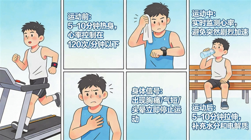 此外,运动前的健康评估,5—10分钟的充分热身,避免低温健身都很有必要。“运动中,锻炼者尤其要关注身体信号,出现胸痛、心慌、头晕、呼吸困难、四肢麻木等症状,立即停止运动,及时就医;避免突然加速、突然发力,保持运动节奏平稳。”吴卫东强调说,运动时,上至耳垂附近下至肚脐周围,这之间任何部位出现不适,都可能是心脏病的体征,必须引起重视。运动后,也要做好放松整理,缓慢降低运动强度,不要立即停下、蹲坐或洗澡,要及时补充水分,少量多次饮用,避免一次性大量饮水。