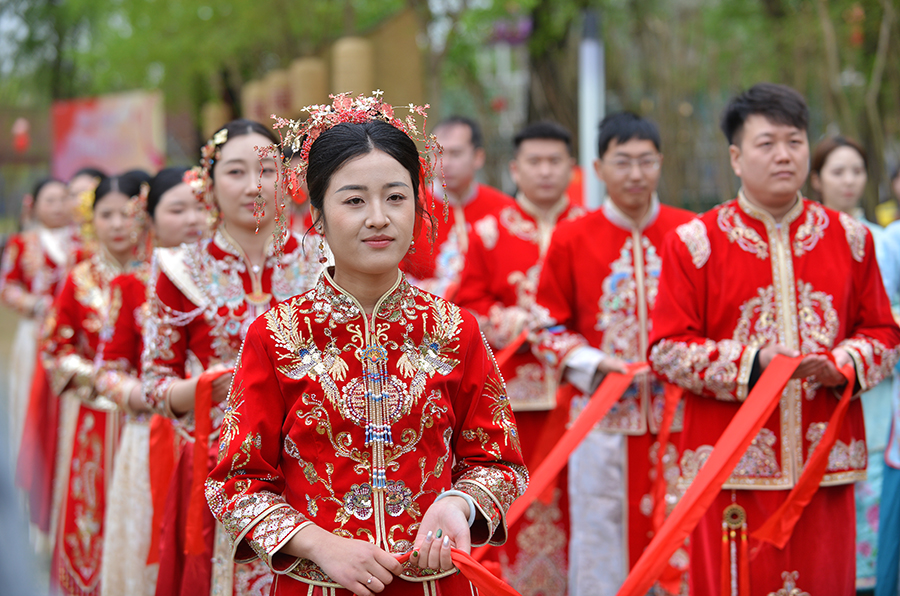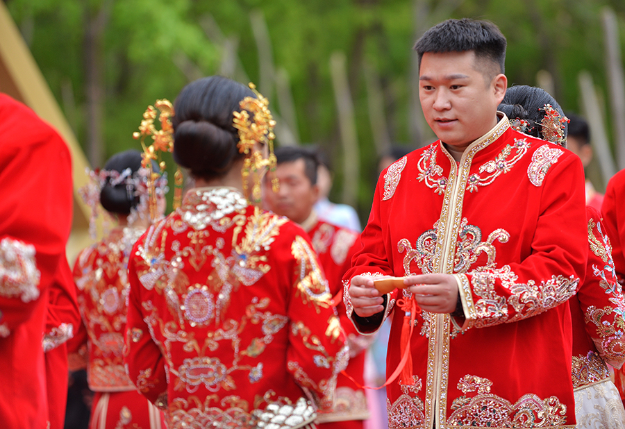 4月8日,“豫鲁联姻”2026年中式集体婚礼暨新风青年派对活动现场,新人正在进行传统婚俗仪式。