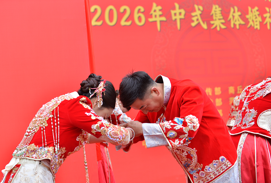4月8日,“豫鲁联姻”2026年中式集体婚礼暨新风青年派对在河南省商丘市梁园区举行。仪式上,新人身着中式礼服,依次行解缨礼、夫妻交拜、合卺礼、执手礼等传统婚俗礼仪。
