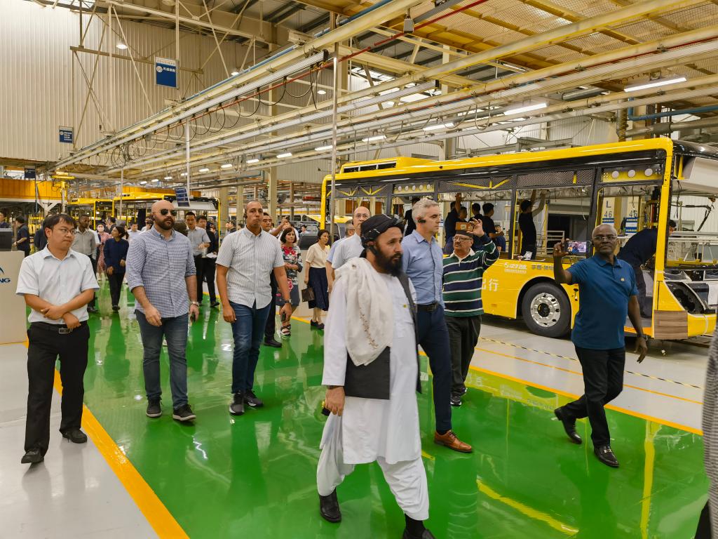 使节们在郑州市宇通客车股份有限公司新能源厂区承装车间参观。新华社记者 袁帅 摄