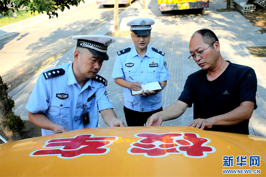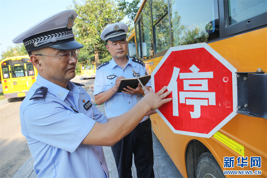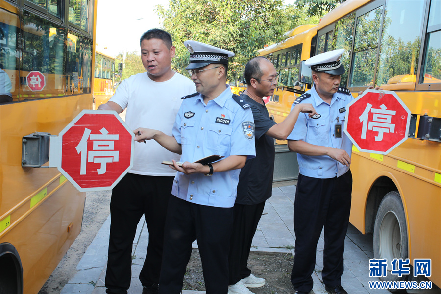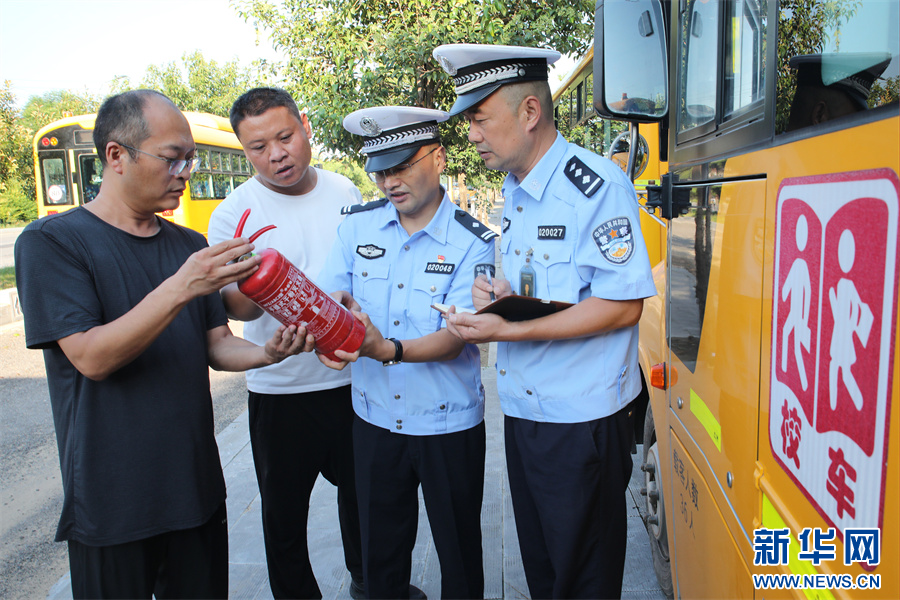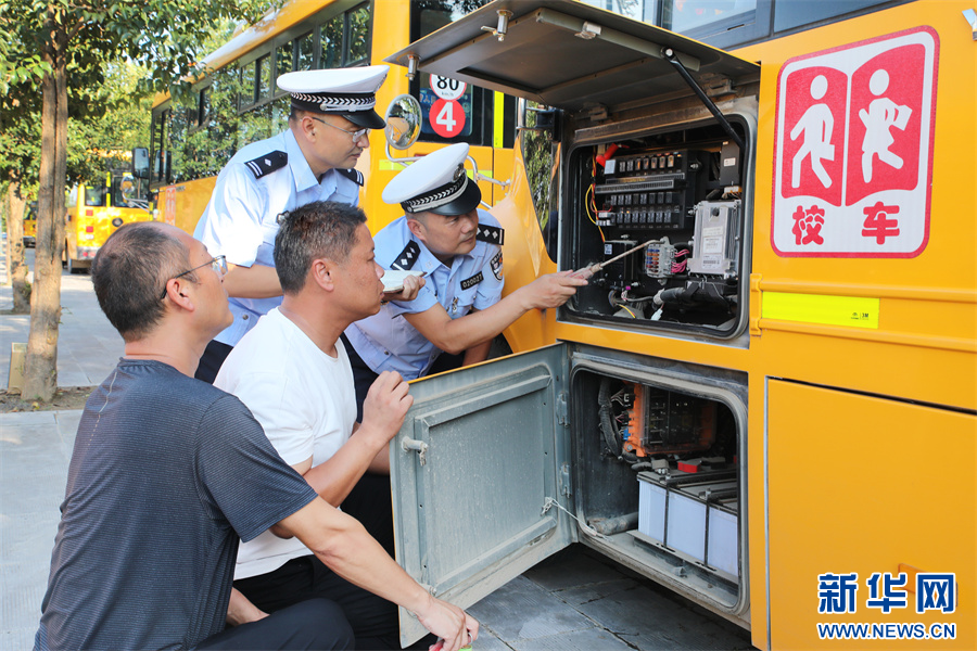 8月28日,河南省开封市尉氏县交警大队民警正在对辖区校车进行安全检查。