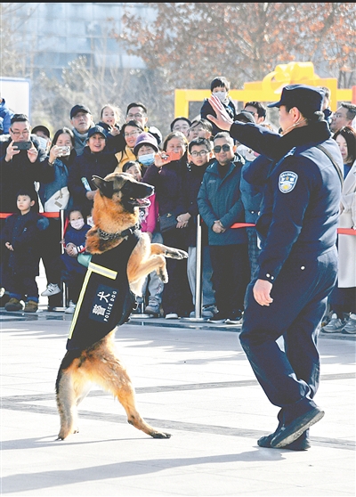 人气警犬与民警互动 记者 马健 周甬 摄