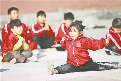 “来,展示一个‘叶下藏花’。”1月15日,新密油坊庄,4岁的李道安在爷爷李中喜的指导下练习起李家拳和童子功。小姑娘今年正式开始学拳,动作尚显稚嫩,眼神中却透露出超出年龄的坚定,一招一式间带出的是一丝不苟的味道。