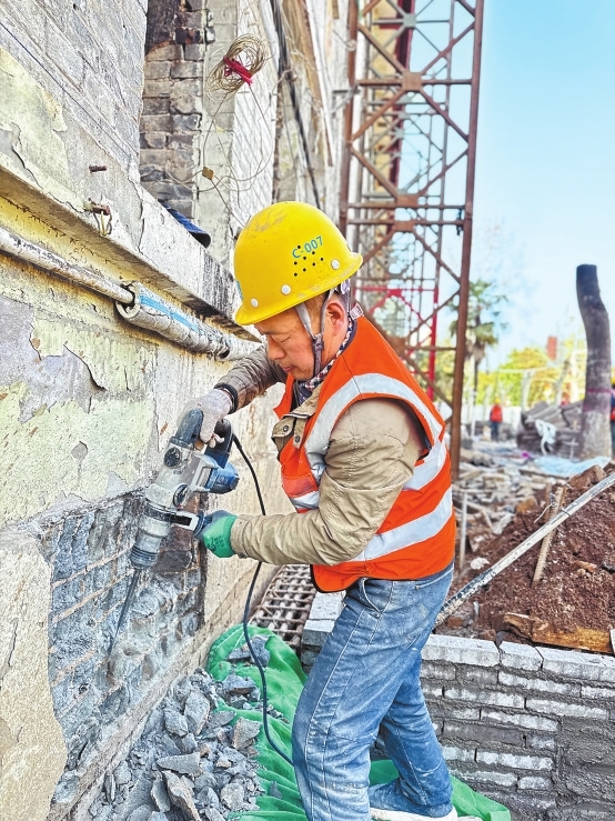 记者在现场看到,汽车吊挥舞着“长臂”,正在浇筑混凝土;绑扎钢筋的工人手法娴熟,一根根钢筋在他们手中被精准地固定成型;粉刷工人在建筑外墙精雕细琢,悉心修复着每一块砖瓦。
