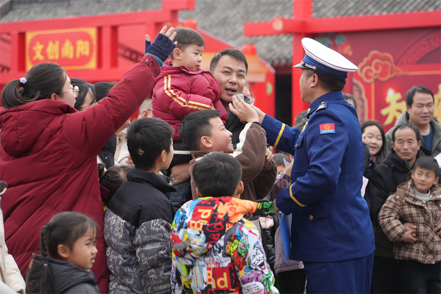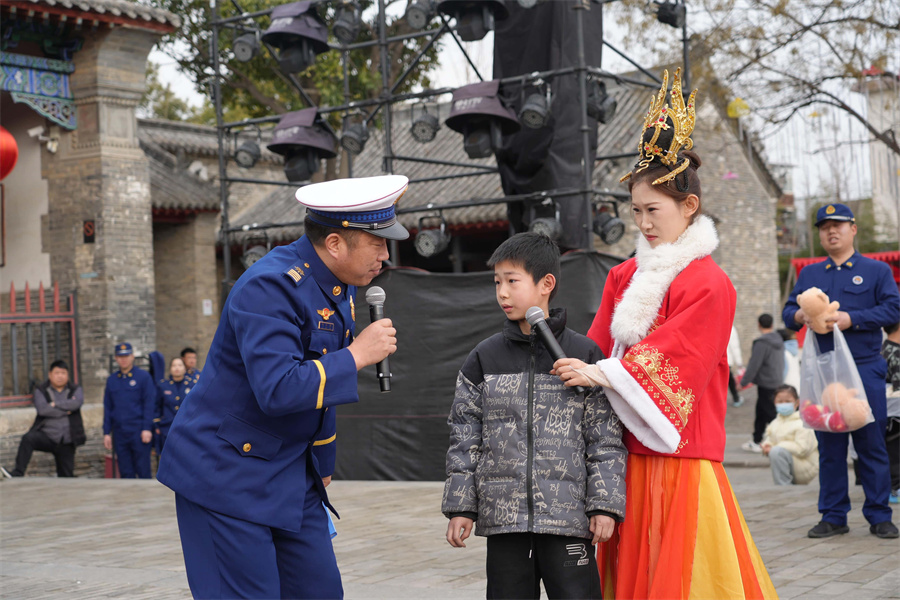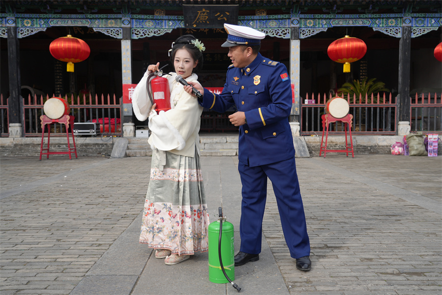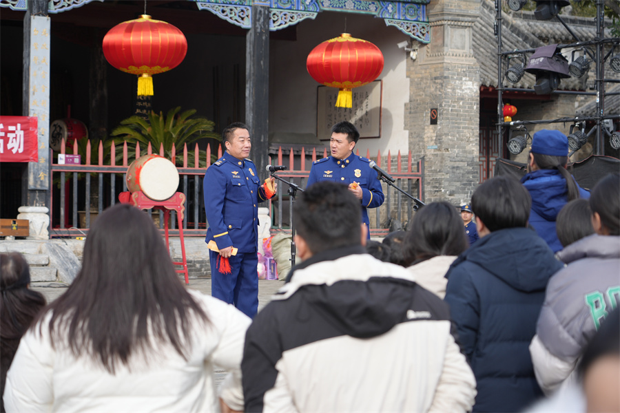2月6日,在南阳府衙,消防员以曲艺的形式宣传消防安全知识。