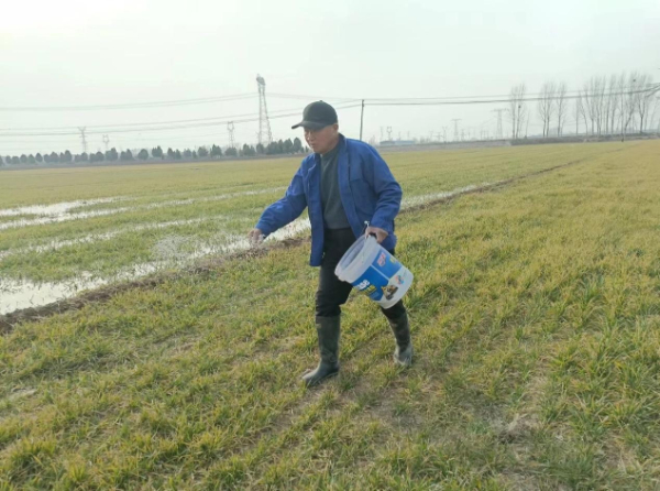 2月18日,原阳县葛埠口乡朱柳园村村民朱云社在麦田灌溉、施肥。刘雪敏 摄