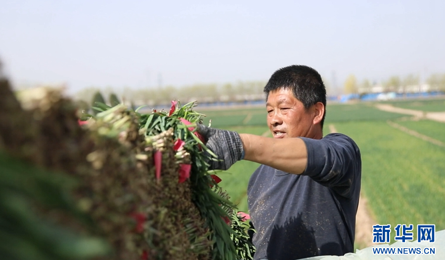 3月25日,在河南省台前县夹河乡陆楼村,种植户董正高在将刚收割的韭菜打捆装运。