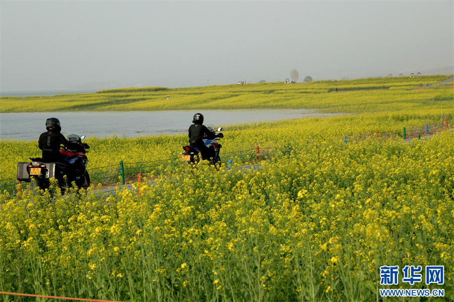 3月31日,嵩县陆浑镇楼上村,游人骑行在油菜花田旁的道路上。(赵明辰 摄)