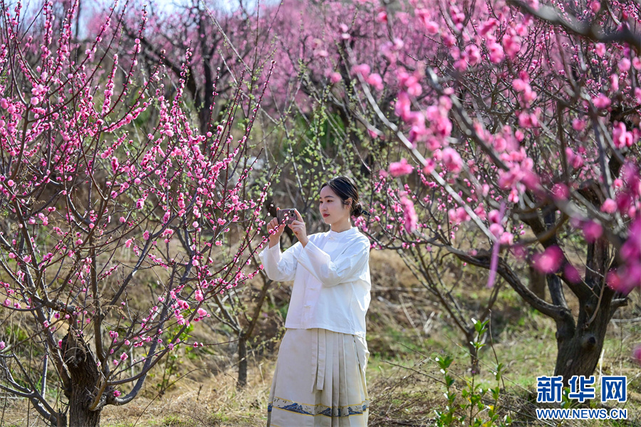 3月30日,嵩县德亭镇元湾村空山梅园,游客在打卡拍照。(李卫超 摄)
