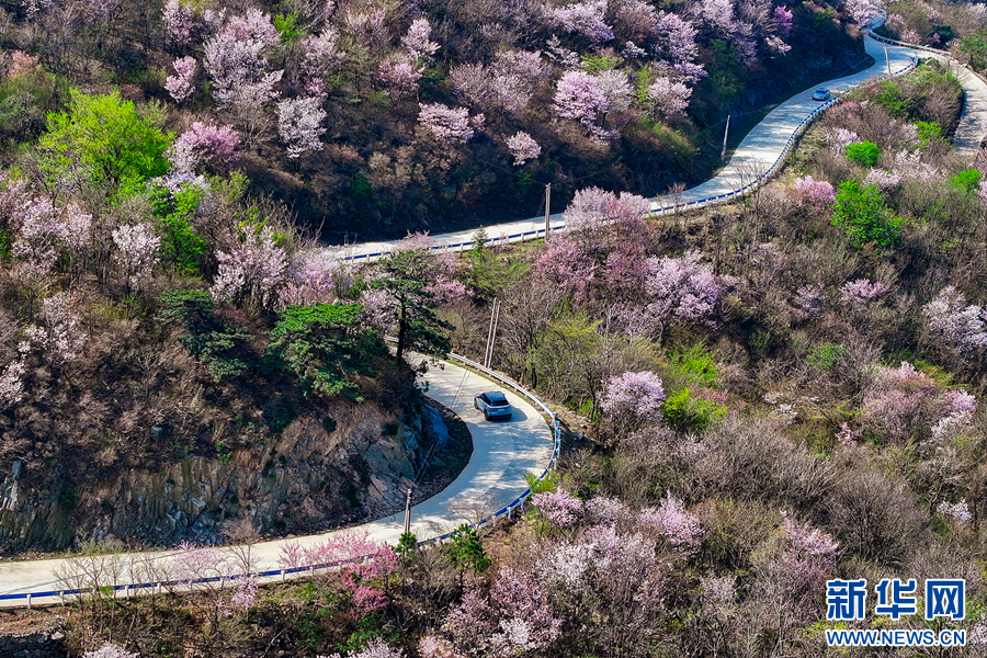 4月5日,新县黄毛尖国家森林公园,蜿蜒的山路两旁长满野樱花。