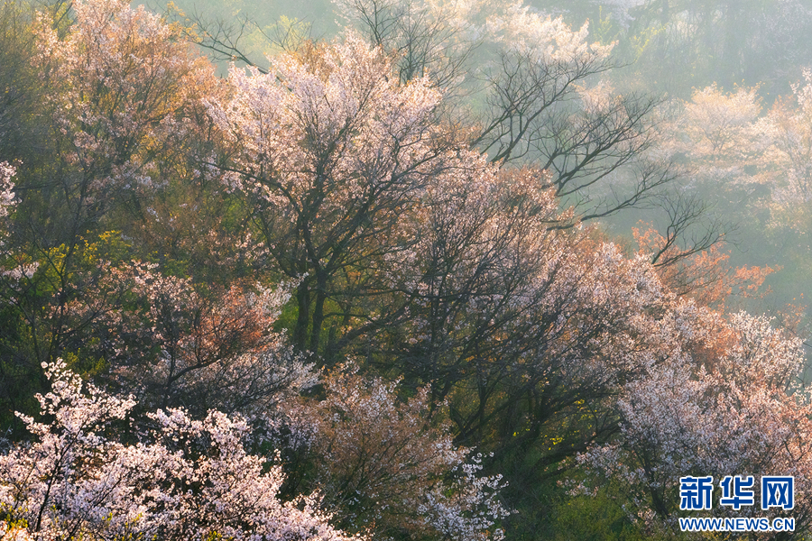 时下,漫步在河南省信阳市新县黄毛尖国家森林公园里,原生态野樱花沿着海拔800余米的山脊次第绽放,粉白花海与苍翠林涛相映成趣,绘就一幅春日画卷。