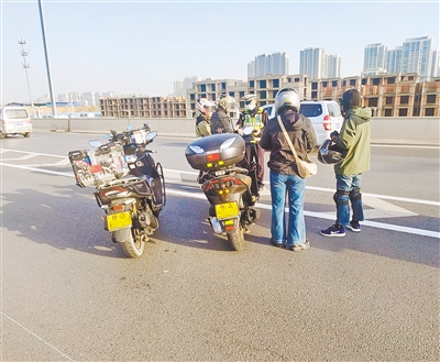 交警对违法上高架的大货车和摩托车车主作出处罚