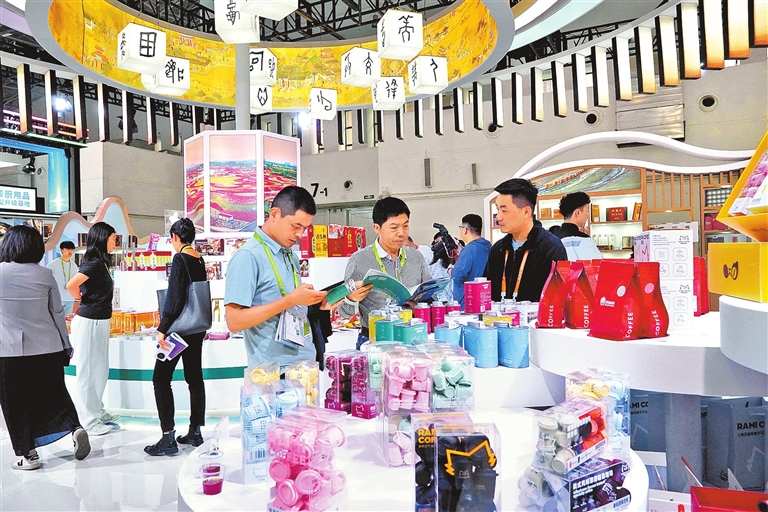 展馆C位,蜜雪冰城带来的新品吸引观展者纷纷打卡留念。“今年我们丰富了产品线,与木版年画等河南元素联名,开发出‘全球雪王 老家河南’周边产品,让全球消费者知道‘雪王’的老家在河南。”现场忙着介绍的蜜雪冰城工作人员说,河南的深厚文化赋能雪王走得更远,“我们也希望借助消博会这一国际性平台,进一步扩大蜜雪冰城的国际影响力,吸引更多企业加入产业链上下游,聚力合作、共赢发展。”