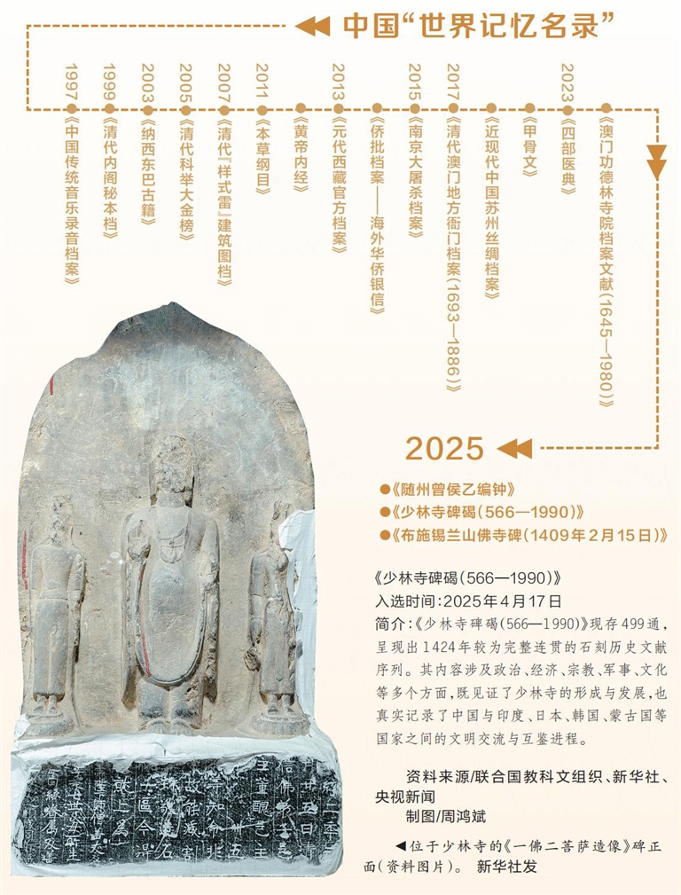 4月17日,联合国教科文组织发布新闻公报,宣布将74项文献遗产新列入其《世界记忆名录》,其中包括中国组织申报的《随州曾侯乙编钟》《少林寺碑碣(566—1990)》以及中国与斯里兰卡联合申报的郑和遗存《布施锡兰山佛寺碑(1409年2月15日)》。至此,中国共有18项文献遗产入选《世界记忆名录》。