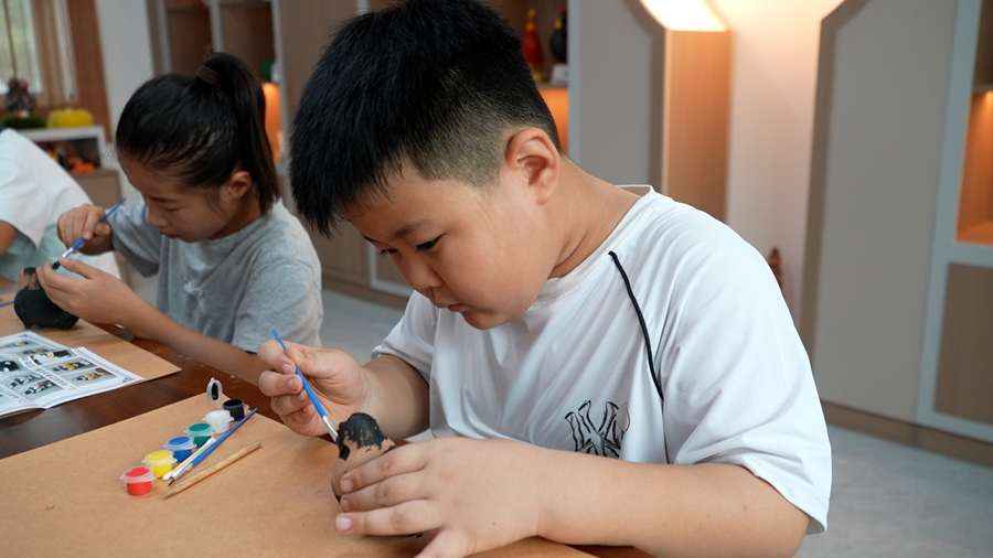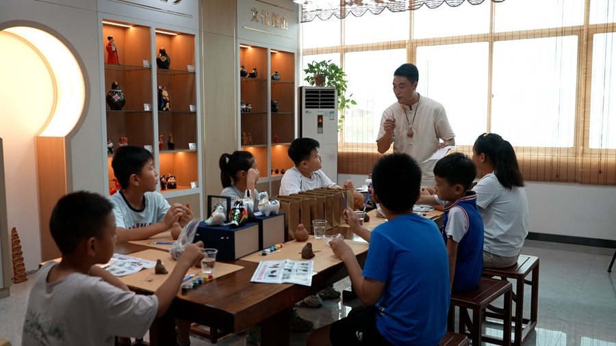8月11日,孩子们在老师带领下制作“泥咕咕”泥塑作品。