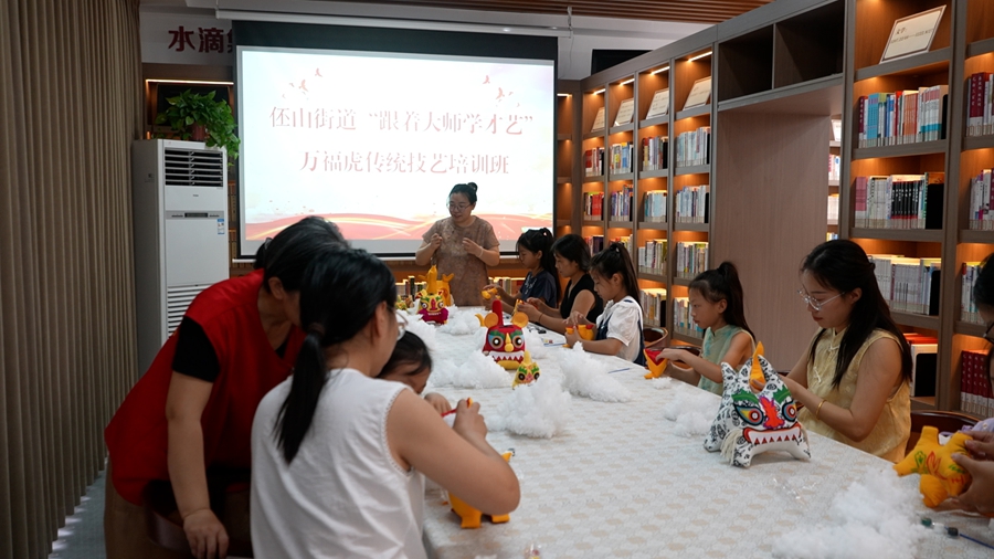 8月11日,孩子们在老师带领下制作“万福虎”布艺作品。