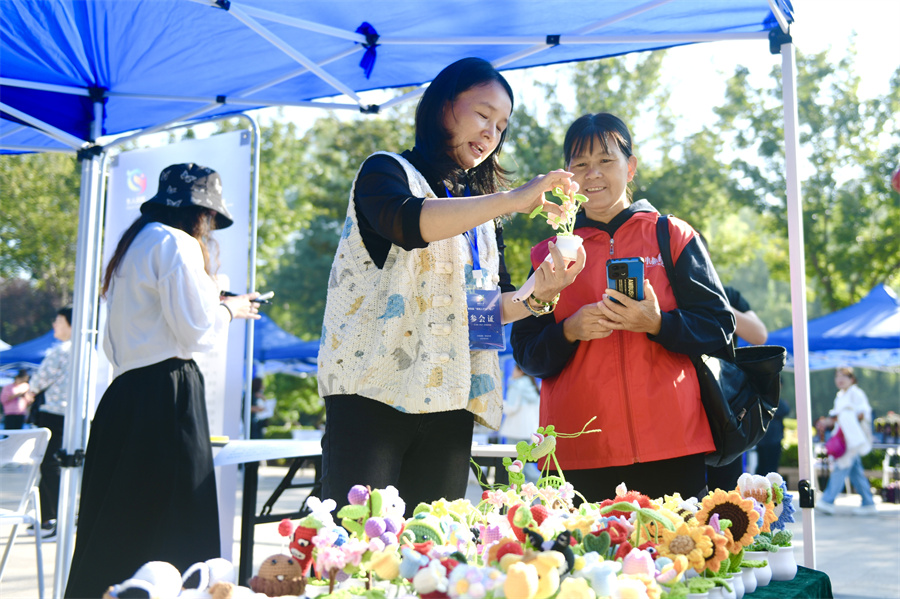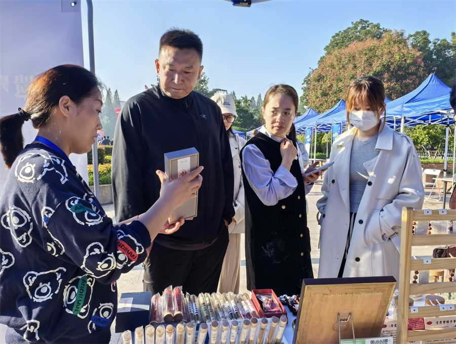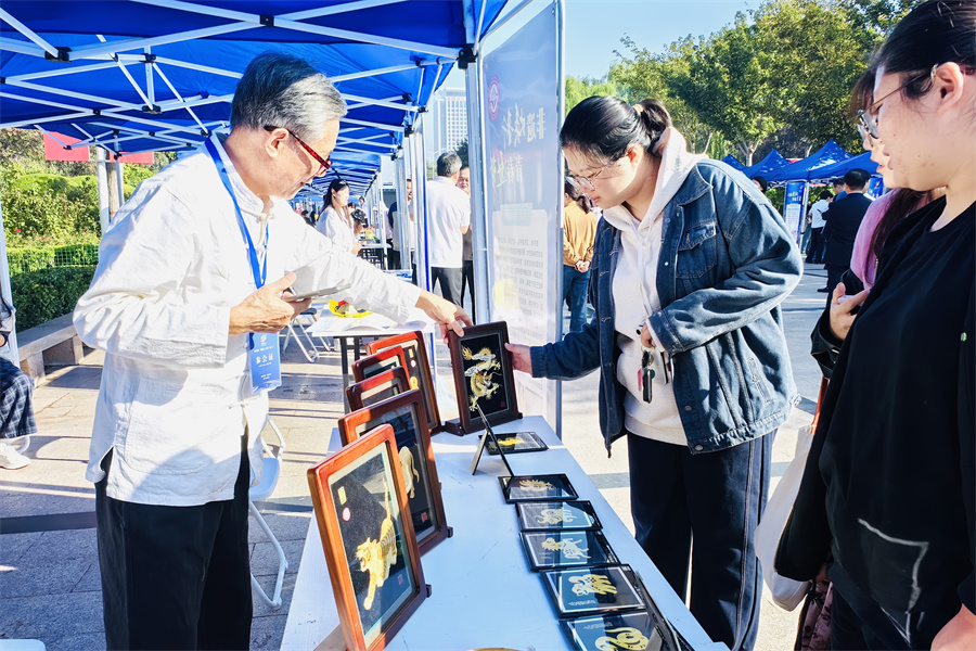 9月25日,河南濮阳,市民在活动现场了解非遗产品。