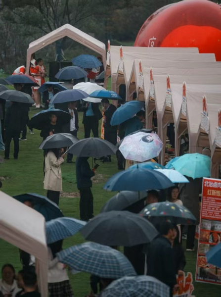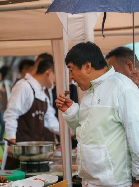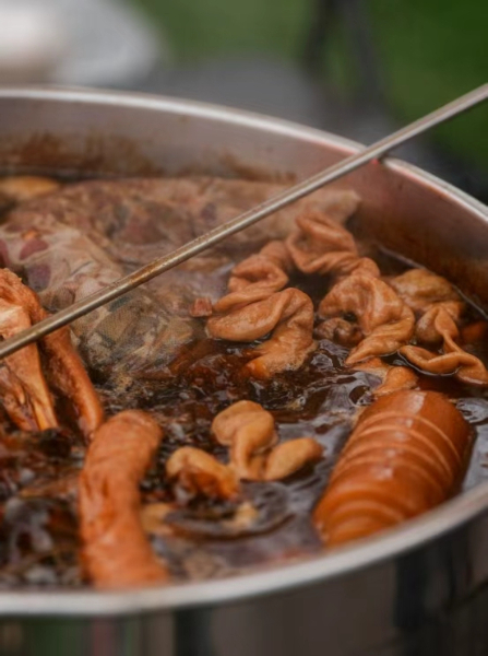 活动现场,近30家参赛摊位现场制作,绵绵细雨伴着阵阵肉香,牵动着往来行人的味蕾,卤猪肘、烧鸡、红烧羊蹄……晶莹油润的色泽与扑鼻卤香,引得往来游客纷纷驻足品尝。