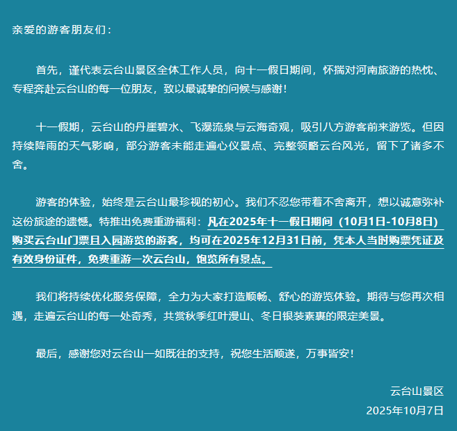 据介绍,今年十一假日期间,云台山的丹崖碧水、飞瀑流泉与云海奇观,吸引了八方游客前来游览。但受持续降雨的影响,部分游客未能完整领略云台山风光,留下了诸多不舍。为弥补这份遗憾,云台山景区决定,凡在2025年十一假日期间(10月1日至10月8日)购买云台山门票且入园游览的游客,均可在2025年12月31日前,凭本人当时的购票凭证及有效身份证件,免费重游一次云台山,饱览所有景点。