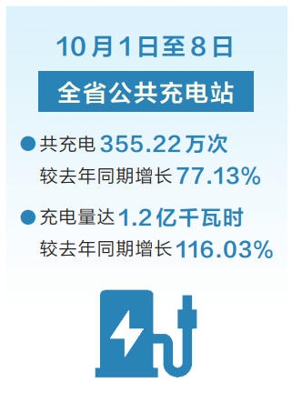 在国庆中秋假期出游热潮带动下,河南新能源汽车出行充电量和充电车次再创历史新高。10月9日记者获悉,基于河南省充电智能服务平台监测数据,通过对接入该平台的超16.5万台公共充电桩统计分析,10月1日至8日,全省公共充电站共充电355.22万次、较去年同期增长77.13%,充电量达1.2亿千瓦时、较去年同期增长116.03%,绿色出行需求持续表现强劲。
