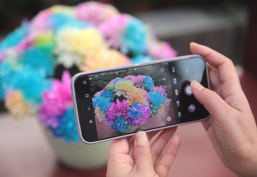 10月18日,游客在开封市龙亭公园拍照赏菊花。李新义 摄