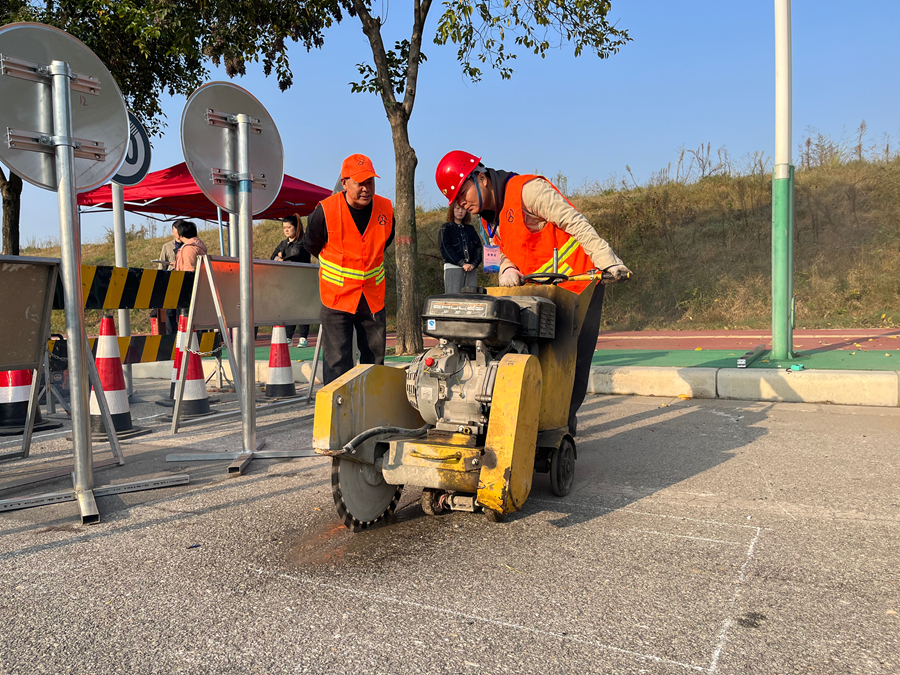 10月28日,工人在坑槽挖补比赛现场切割坑槽。张旭 摄