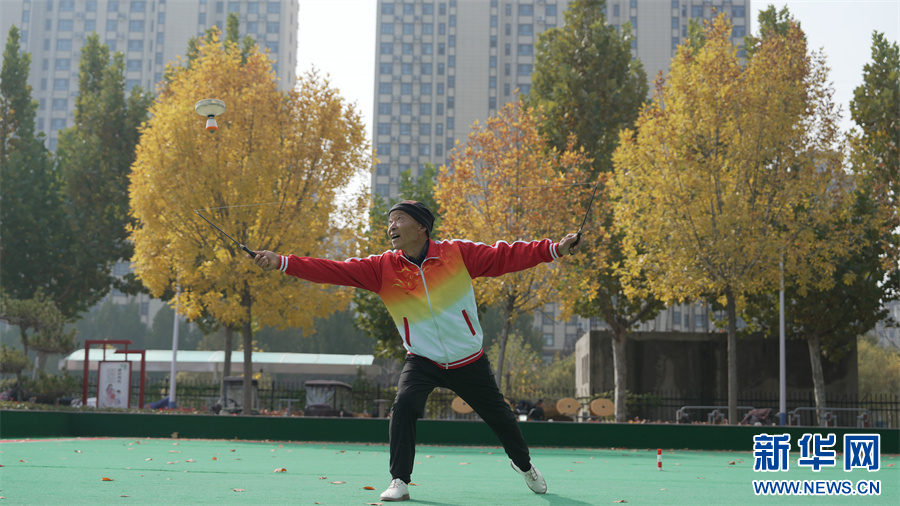 10月29日,在内黄县老干部教育活动中心,一名学员在进行抖空竹训练。
